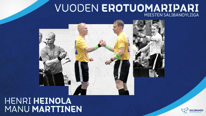 Joukkueiden kapteenien äänestämä kauden erotuomaripari miesten Salibandyliigassa: Henri Heinola – Manu Marttinen.