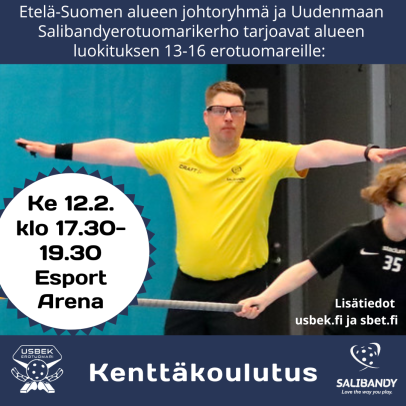 Pitkään kaivattu kenttäkoulutus alueemme tuoreille salibandyerotuomareille on viimein täällä! Kentällä toimimiseen keskittyvä koulutus järjestetään keskiviikkona 12.2.25 kello 17.30-19.30 Esport Areenalla. Koulutuksen järjestää yhteistyössä USBEK ja Etelä-Suomen alueen johtoryhmä.