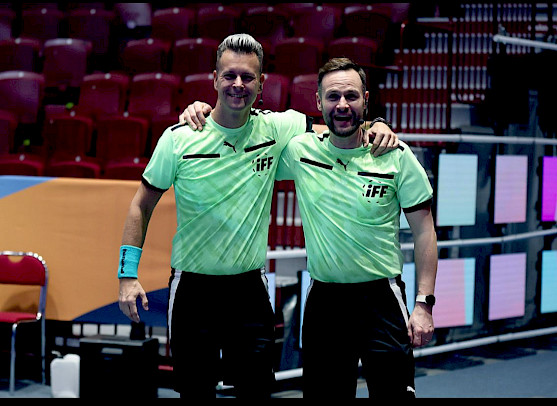 Ottelun erotuomareina toimivat alueemme kärkituomareihin kuuluvat Thomas Ellis ja Janne Sjögren, jotka ovat jo kolmansissa aikuisten MM-kisoissaan. Tässä turnauksessa he ovat päässeet esittämään taitojaan jo viidessä pelissä, myös yhdet näiden molempien joukkueiden alkusarjapeleistä. Välieräpeli on ensimmäinen heille laatujaan tällä tasolla ja kyselimmekin tuntemuksia pelin alla tähän astisesta turnauksesta.