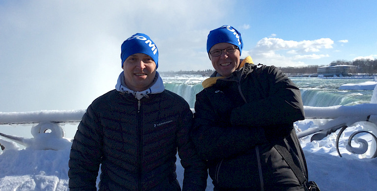Kuva on Tom Kirjosen kotialbumista ja siinä ovat Tom (vasemmalla) tuomariparinsa Jyrki Sirkan kanssa Naisten 2015 MM-kisakarsintareissulla Kanadassa Niagaran putouksilla.